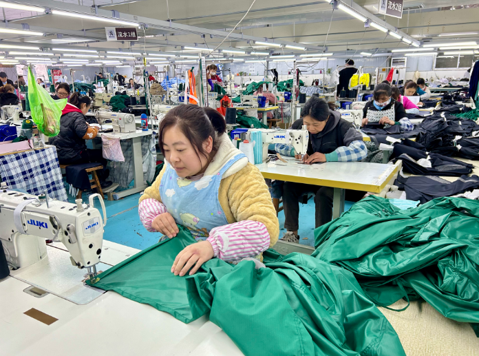 与此同时,位于船山区的遂宁市迪枫服装有限公司(以下简称“迪枫服装”)一期生产车间内也同样忙碌,百余名工人忙着打样、剪裁、拼接、包装客户所需订单。